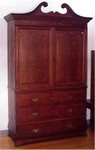 TIGER OAK DOUBLE DOOR LINEN PRESS: Two part cabinet with 7 shallow drawers to the interior of the upper part. Paneled doors, broken pediment across the top. Lower section of 2 drawers over 2 full length drawers, the bottom being bombay. A fine piece that will come around not too often. Approx. 91"h, 51"w, 22 1/2"deep. | 2,000 |
