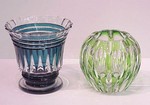 MOSER QUALITY CRYSTAL ROSE BOWL AND VASE: 2 pieces of heavy older Bohemian glass to include, a green cut to clear rose bowl, 5 1/2" dia. and a teal cut to clear pedestal vase of the same fine quality, 6"h, 6" dia. Please note polished chips to rim of vase. | 100 |