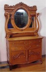 AMERICAN GOLDEN OAK SIDEBOARD WITH CARVED SWANS: Backboard with central oval beveled mirror flanked by 2 smaller rectangular beveled mirrors, fabulous carved swan supports, candle shelves, and full length shelf. Top most crest is carved with maiden head at each end. Cabinet base comprised of 2 drawers over full length drawer over double doors. Approx. 87"h, 4'w. 24" deep. | 1,100 |