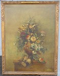 SUPERIOR 19th C FLORAL BOUQUET IN NEOCLASSICAL URN, O/C: 43 1/2" x 32 1/4", illegibly signed lower right, encased in period gilded floral motif molding. Condition - Several patches visible verso, several tears to canvas, in desperate need of cleaning. | 700 |