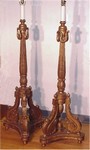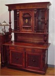 19th C BURLED WALNUT AND MAHOGANY CARVED SIDEBOARD: Enclosed upper center section flanked by open, galleried shelving. Fabulous carvings and detail throughout. Warm rich patina. 7'2"h, 57"w, 28" deep. | 850 |