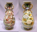 PALATIAL MEIJI PERIOD SATSUMA FLOOR VASE: Scenes of war and peace. A monumental ring handled floor vase with dragon heads and rich polychrome enamel and gilt decorated panels depicting scenes featuring martial arts combatants and battle scenes with Samurai and weaponry, 42"h. Ca 1868-1911. Note damage to dragon handles and star to base of vase. | 850 |
