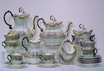 AN IMPRESSIVE KPM FINE GERMAN PORCELAIN TEA / COFFEE SERVICE: Comprising a coffee pot, 10 1/2"h, and a 8 1/2"h. tea pot, 7" cream jug, covered sugar and seven cups with saucers. Hand painted floral decoration. Gilt enhanced with some wear to the gold. | 600 |