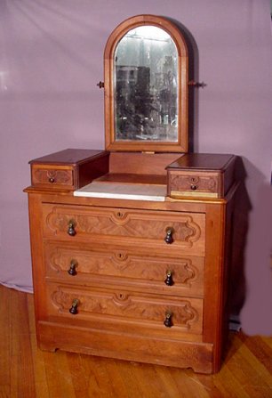 EARLY VICTORIAN MAHOGANY CHEST: Two over three drawer chest topped by two glove boxes flanking pedestal mirror in ornately carved frame with shaped cornice, flame grain panels to drawer fronts, top centered by inset rectangle of variegated light grey marble, lovely foliate scroll escutcheons and bead trim to drawers, pinwheel carving to pulls, 42 1/2"w. x 18"d. x 82"h. | 350 |