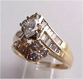 LOVELY LADY'S DIAMOND BYPASS RING: Centered by a marquise cut diamond of approx. 1/4ct, in a double bypass mount of 14k yellow gold, set with baguettes, each side ending in four graduated round brilliant stones. Marked 14k CI. | 150 |