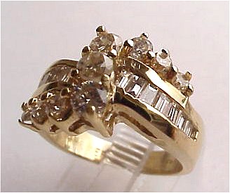 LOVELY LADY'S DIAMOND RING: Round brilliant cut stone set in Z across 14k yellow gold band channel set with baguettes, approx. 1ctw of sparkle. | 150 |
