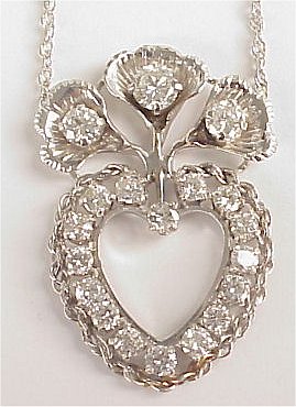 CHARMING 2.5ctw DIAMOND HEART NECKLACE: Sixteen round full cut diamonds set in heart shape pendant of 14k white gold topped by three foliate flares each centered with it's own round full cut diamond, average SI1-I1 in clarity and H-I in color, all diamonds prong set, approx. 2.5 carat total weight, fine rope chain attached to pendant (approx. 17"l.) Sold with August 2003 GIA gemologist appraisal, retail replacement value $4550** | 1,200 |