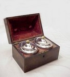 BANDED INLAY TEA CADDY WITH SILVER CANNISTER INSERTS: Pair of oval shaped canisters with ivory finials nestled in an inlay mahogany box. The canisters are marked "Silver Edg'd" and have armorial engraving. Canisters and box lock, though the mechanism is missing on one canister, no key. Interior of box lid is sarcophagus shaped, with silver rope threading. 6 1/2" x 10 1/2" x 7". From the estate of Elton Hoyt II. | 600 |