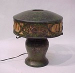 HEINTZ ART METAL TABLE LAMP: Sterling design on bronze with original vivid green patina. The cut out designs on the removable shade are highlighted by silk lining. Paper label, 11"h., shade is 10" dia., single pull chain socket. | 1,500 |