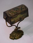 RAINAUD ADJUSTABLE DESK LAMP WITH REVERSE PAINTED SHADE, CA. 1920'S: Original antiqued bronze finish, single pull chain socket. Base signed on underside. Shade is 9"l, lamp is 15"h. overall. | 400 |