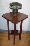 L & JG STICKLEY TALL STAND #574: 2 tier stand, the top having cut corners, spline construction. 4 straight legs with square center shelf. 29"h, top is 18" square. Slight separation between two top boards. May have been refinished many years ago. Unmarked. | 600 |