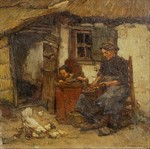 19TH C SCOTTISH ILLUSTRATION O/C: Depicts a mother sewing child's garment with child and terrier in an interior, O/C laid on board, 19 1/4" x 16", monogrammed lower left CM?. Condition - Some separation of canvas, some repaired tears, craquelier throughout, tear in upper margin approx. 2"l., in need of cleaning. | 250 |