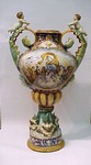FABULOUS EUROPEAN FAIENCE URN: Bright hand painted polychrome decoration. Full bodied putti on acanthus leaf handles, Bacchus masquerons, trio of dolphins swirl around the base. Each side hand painted with a mythological scene. Please note condition flaws. 31"h. | 750 |