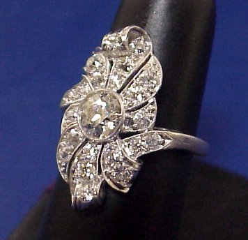 PERIOD DECO PLATINUM DIAMOND RING, Circa 1930: Beautiful bow motif encrusted with diamonds and centered by a round brilliant stone, just under 1 carat, clean! Ribbons covered with approx. 22 Euro cut diamonds approx. 1.30ctw., near colorless, relatively clean throughout. Entire ring totaling approx. 2 1/4 carat, size 7 1/2, approx. 9 grams, assayed platinum. Est. $6000/8000**