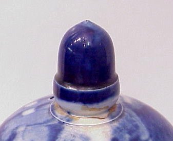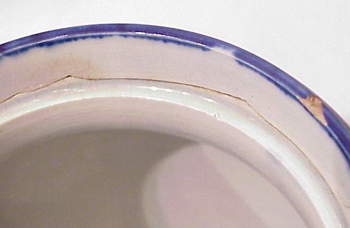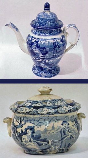 STAFFORDSHIRE BLUE TRANSFER ''WOODMAN'' TEAPOT AND SUGAR: Ca. 1822-1833. Joseph Stubbs, Longport Staffordshire. Tall teapot, 10''h. is in delicate condition. (crack around entire rim and repaired finial). The covered sugar has darkened in color and has a chip under the lid and on the finial.