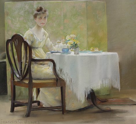 JONES, Francis Coates, (American, 1857-1932): ''Tea Time'', Pastel, 12'' x 13 1/4'', pencil signed lower left, unframed, not laid, in good overall condition. Pencil sketch of female figure verso.