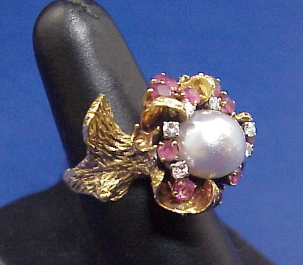 NATURALISTIC PEARL, RUBY & DIAMOND DINNER RING: Branch motif mount of 18k yellow gold staring an approx. 9.5mm free form pearl in a lovely soft grey, accented by 6 small diamonds and 13 rubies of various size (note one additional spot for another ruby), size 8, 20 grams.