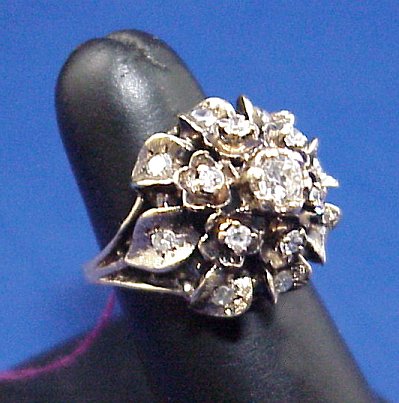 FLORAL DIAMOND CLUSTER RING: 15 Diamonds featuring a Euro cut center stone of approx. 30pts set in an etched floral and foliate motif mount of 14k, size 6.5, approx. 8 grams.