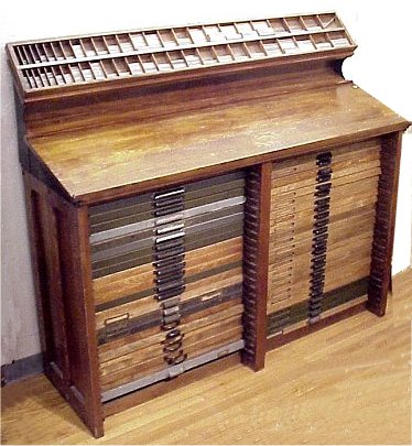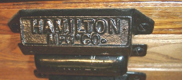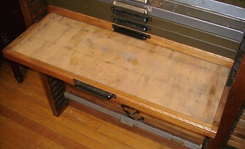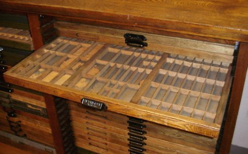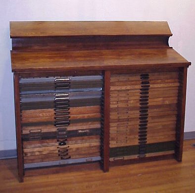 HAMILTON GOLDEN OAK PRINTER'S CABINET: 46 drawers, 25 of which are sectioned, 9 drawers are metal front. 63 1/2''h x 72''w x 24''