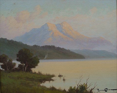 CATALAN, Ramos, (Chilean, 19th/20th C): ''Lago Lofgren'', O/C, 19 1/2'' x 24'', signed lower right, encased in period carved frame, 23 1/2'' x 27 1/2'' with minor wear. Condition - There are several pinholes and abrasions in the upper left corner and along the upper margin and a small pinhole in the lower right corner by the signature, needs cleaning.