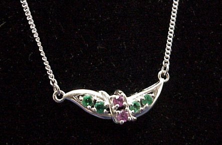 PLATINUM EMERALD & RUDY CHEVRON NECKLACE: Delicate platinum necklace, 4 grams, set with round cut emeralds and rubies, 17''l.