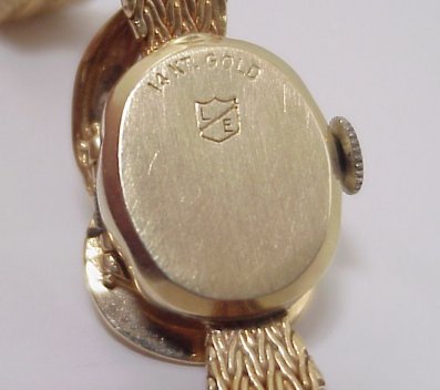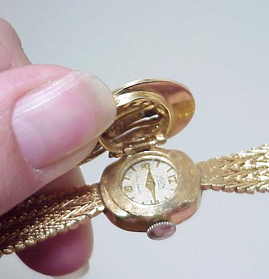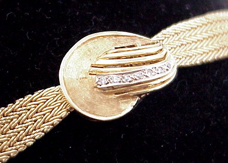 LADY'S 14K GOLD & DIAMOND WRIST WATCH: 14k yellow gold case with attached mesh bracelet by LE, hinged dial cover in a plume motif with applied row of bead set diamond accents, serial # 1236399, works by Sellita Watch Co, Swiss, 17 jewel unadjusted, not currently keeping time, needs new crystal, approx. 23 grams without works, 6 1/2''l., safety chain for secure wear.
