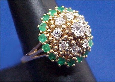 DIAMOND & EMERALD HAREM RING: 14k gold tiered mount topped with diamonds and surrounded by 16 small emeralds. Tip set with approx. 20pt round brilliant cut diamond, row of eight 10pt diamonds separated above and below by gold bead work, marked 14K.P.ODI, size 7 3/4, 7 grams.