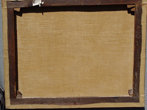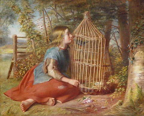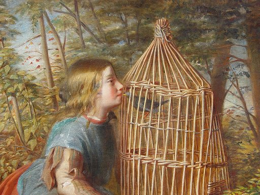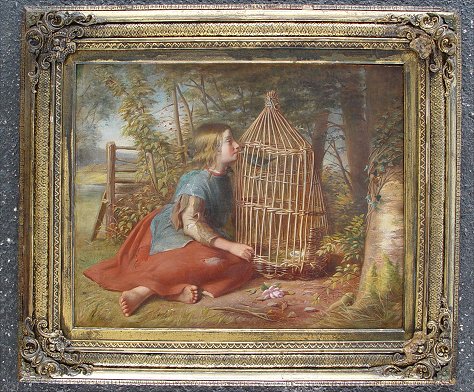 19TH C EUROPEAN GENRE O/C: Depicting a young girl kneeling next to her pet bird in a cage, 16 3/4'' x 20 3/4'', no visible signature. Condition - Has been relined with several areas of in-paint visible by blacklight. Possibly English in origin (pre Raphaelite?). Encased in period gilded frame with some wear, 24'' x 28''.
