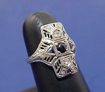 DECO STYLE FILIGREE SAPPHIRE & DIAMOND RING: Lovely etched filigree ring of 18k white gold in a deco style, centered by one round and two triangular cut deep blue sapphires, each end set with three small diamonds, size 5 1/4, 3 grams.