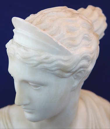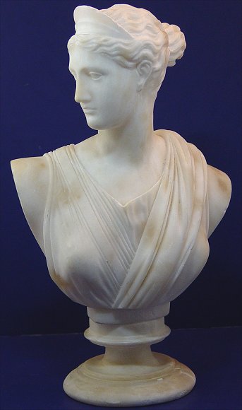 LATE 19TH/EARLY 20TH CENTURY ALABASTER BUST OF DIANA: 14 1/2''h., crack to base with missing slice of alabaster, several scrapes throughout, no visible signature, some chips to her visor.