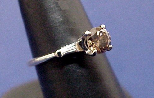CHAMPAGNE DIAMOND SOLITAIRE: Round brilliant cut diamond, vibrant champagne color, approx. 5.5mm x 3.5 approx. 65pts, set in 14k white gold band, accented by tiny white baguettes, size 6 1/2, 2.7 grams.