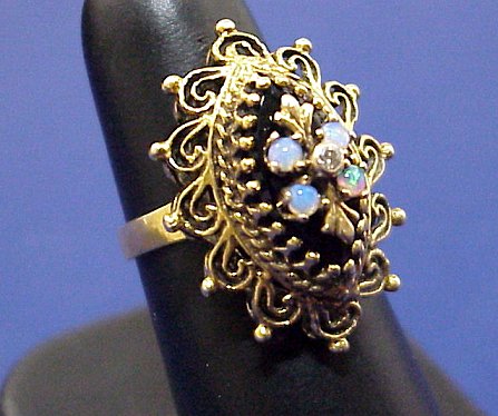 ESTATE OPAL, ONYX & DIAMOND RING: Lovely open work scrolling frame around a pointed oval of onyx, set to the top with four tiny opal cabochons and an equally tiny diamond, marked 14k SB, size 7, 5 grams. Slightly loose opal mount.