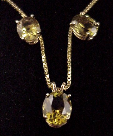 TOURMALINE EARRING AND NECKLACE SET: 14k yellow gold galleried settings with pale greenish yellow tourmalines, post earrings approx. 8mm x 10mm, pendant approx. 9 x 11mm, on an 18'' box chain.