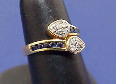 SAPPHIRE & DIAMOND BYPASS RING OF 18K: Approx. 45pts total of round cut sapphires channel set in arms ending in diamond encrusted teardrops, 18k yellow gold mount with white gold around the diamonds, approx. 15pts total, size 6, 4 grams.