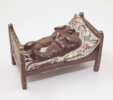 BERGMANN VB DACHSHUNDS IN BED: Adorable sculpture of two dachshunds snuggling on a bed, painted flower bedding, marked to bottom B in jug over Austria, approx. 2''l. x 1 1/8''w. x 1 1/8''h. Est. $200/300**