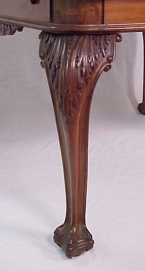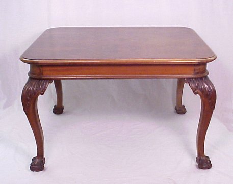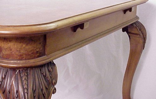 ITALIAN BURL AND CARVED DINING TABLE: Wonderfully carved cabriole legs ending in claw and ball feet, heavily burled table surface. Please note corner repair. 32''h, surface space is 45'' x 49''.