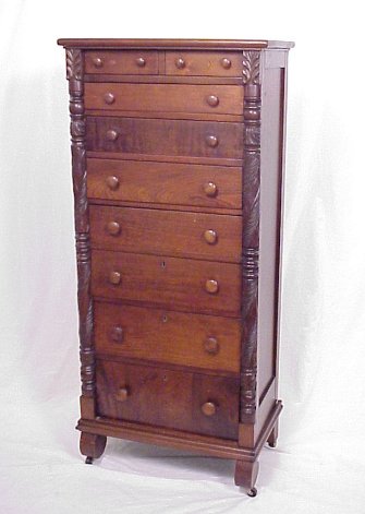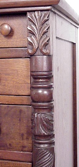 19TH CENTURY NINE DRAWER CHIFFONIER: Multi-wood construction having walnut and flame grain mahogany, early empire styled carved quarter columns, mid 19th century construction. 56'' h, 25'' w, 15'' d.