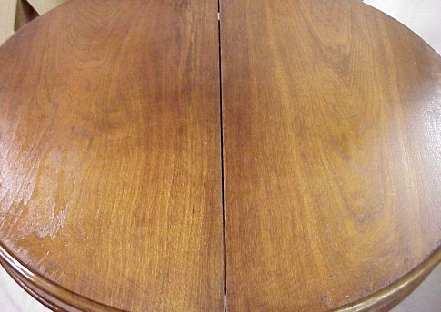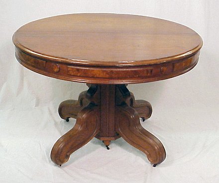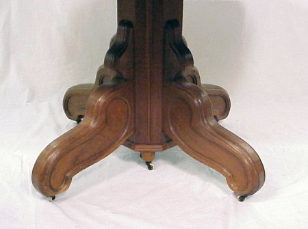 RENAISSANCE REVIVAL VICTORIAN CENTER TABLE: Carved legs support single pedestal, round top 44'' dia. 29 1/2''h, on casters.