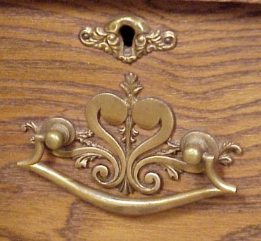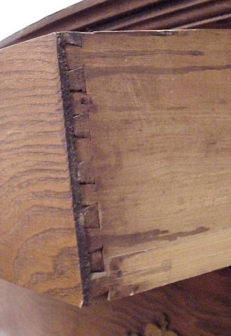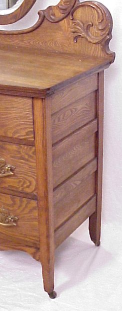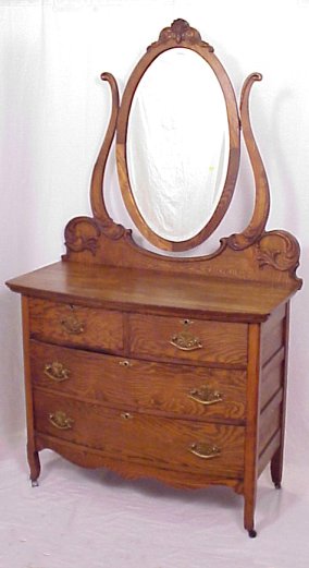 TURN OF THE CENTURY AMERICAN GOLDEN OAK DRESSER WITH OVAL MIRROR: Beveled mirror supported by curved arms, bowed front, 2 half length drawers over 2 full length drawers. Applied carvings. 71 3/4''h, x 41'' x 20''