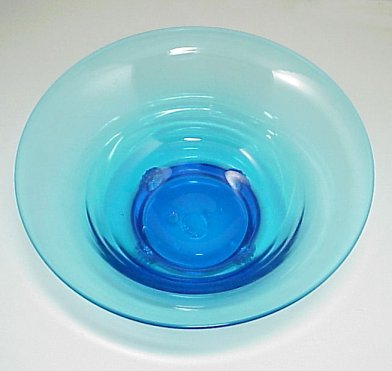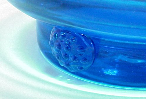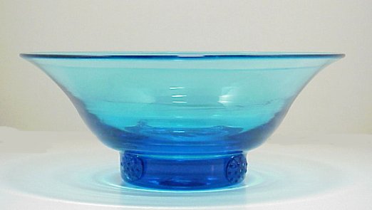 BLUE PRUNT DECORATED BLOWN GLASS BOWL: Marine blue color, one inch base with 4 prunts. Pontil is partially ground. 10 1/4'' dia. 4 1/4''h.