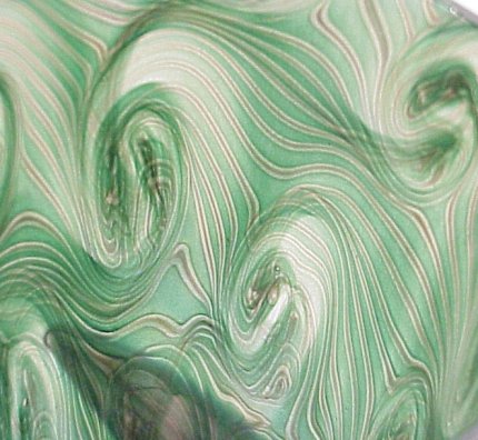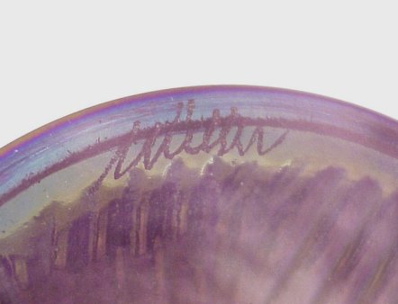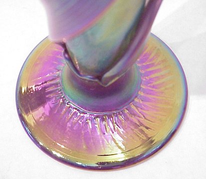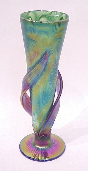 SIGNED IRIDESCENT ART GLASS VASE: Etched signature Muller?. Iridescent peacock colors with applied ''leaves'' wrapping around the trumpet shaped vase for a dramatic effect. No chips or cracks. 10''h.