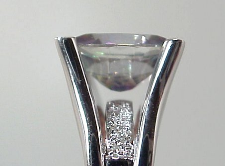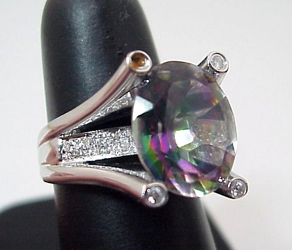 MYSTIC TOPAZ & DIAMOND RING: Colorful center stone 12 x 14mm, raised by four prongs, above a lower band of pave set diamonds, each prong set with tiny diamond (one missing), size 7, 10 grams.