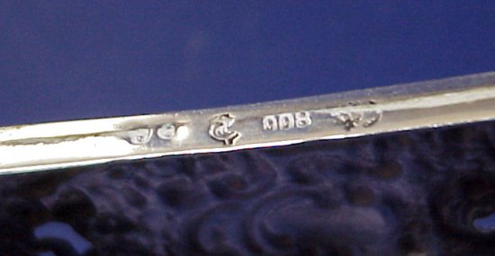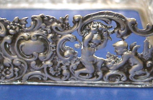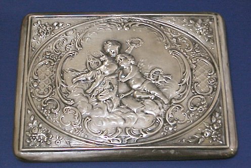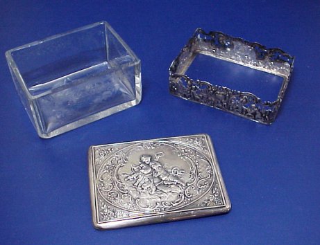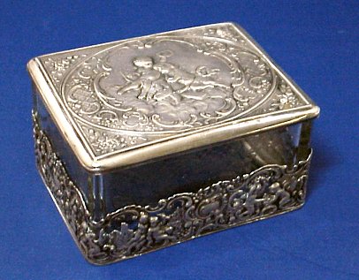 CONTINENTAL SILVER AND CRYSTAL BOX: Etched crystal box fits into cherub decorated silver. The cover is also silver with embossed image of cherubs. Hallmarked 800 and crescent. 2''h x 3'' x 4''.