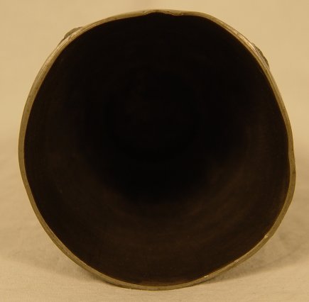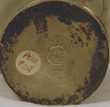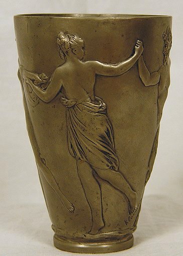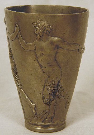 ARTIST SIGNED 19th C MYTHOLOGICAL PEWTER BEAKER: Decorated in embossed images of Satyr and Nymphs. Signed Klacman. Hallmarked with Crown and stylized flower, also impressed EP PES. 6 1/8'', 4'' dia. at rim. Note: True color of this piece is pewter.