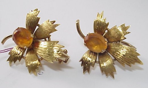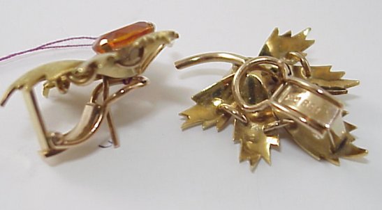 ARGENTINEAN CITRINE 18K LEAF EARRINGS: Large leaves with five lobes each, alternating texture, centered by deep gold citrines, measuring 7.5 x 9 x approx. 5mm, omega post backs, marked Argentina, 750 8.51, 14 grams, 1 1/4''.