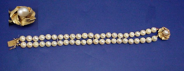 LOVELY DOUBLE STRAND PEARL BRACELET: Two matching strands of 6mm creamy pearls joined by gold support bars, with 14k clasp decorated in a foliate motif centered by a matching pearl, pressure clasp with safety, 7''l., 47 pearls total.