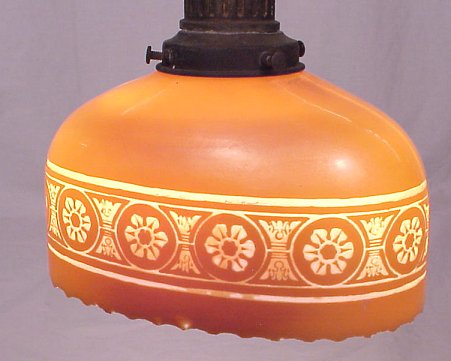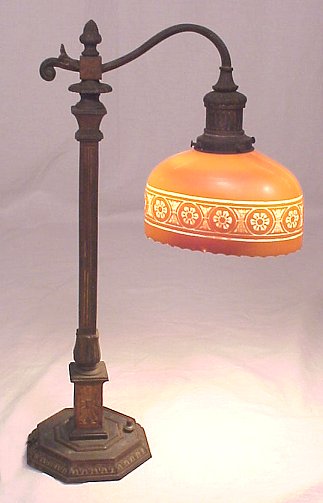 LAMP WITH STEUBEN ETCHED ALABASTER GLASS SHADE: Etched Calcite or Alabaster shade with a luster umber finish. Shade is 7 3/8''l. oval, unsigned, chip on scalloped rim. Vintage iron and metal base. 20 1/2''h. including acorn finial.