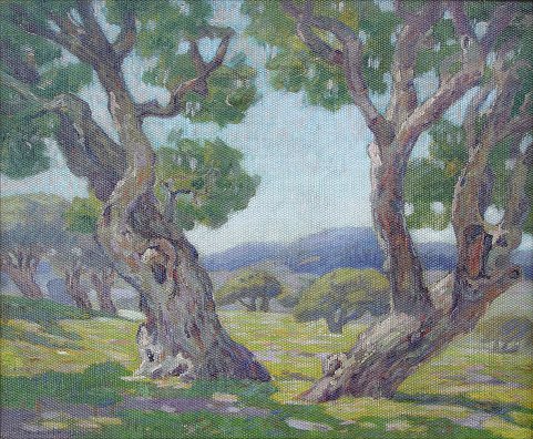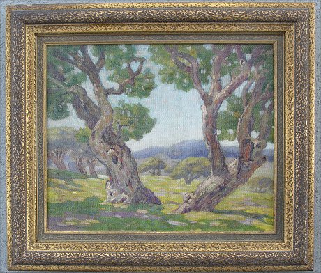 HOUSE, Howard Elmer, (American, 1877-1967): ''The Old Live Oaks'', O/Masonite, 13'' x 15 3/4'', signed lower left, period frame with chunk missing in top upper left corner, 18 1/4'' x 21''. House studied at the Chicago Art Institute and the Chicago Academy of Fine Art. His early landscapes were California plain aire influenced, lived in Portland, Oregon.