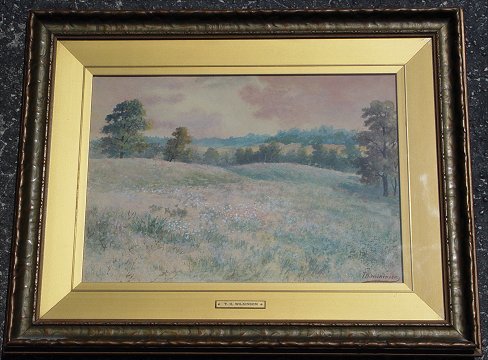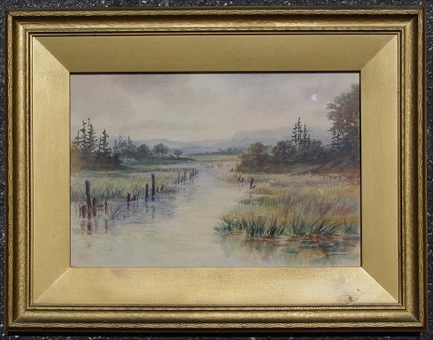 WILKINSON, Thomas Harris, (Canadian, 1847-1929): Two piece lot. First picture is a pastoral landscape with country trail and sheep, W/C, 13'' x 19'', signed lower right, some staining throughout, encased in a later wood frame with gilded accent, 21'' x 26 1/2''. Second picture is a meadow scene, W/C, 10 1/2'' x 14 3/4'', signed lower right, encased in a period gilded frame, 17'' x 21 1/2''. Condition - Some overall darkening to the image, but generally in good condition. Two paintings sold as a lot.