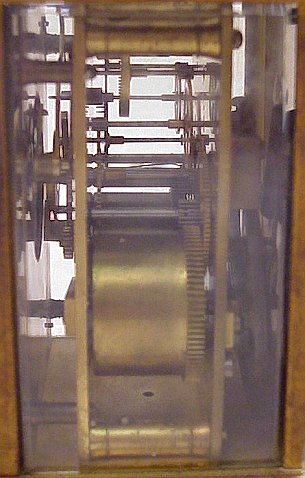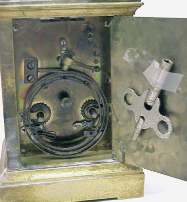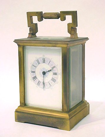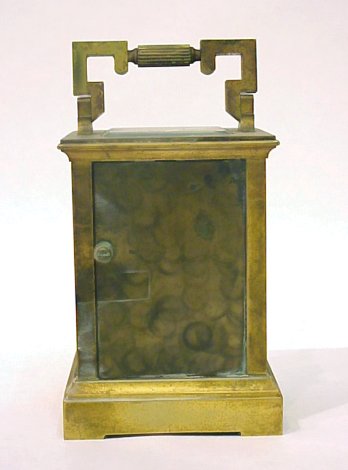 FRENCH BRASS CASE CARRIAGE CLOCK: Bevel glass on three sides and top, solid brass back door. The name on the dial is indecipherable, hairlines across the top of the dial. 5 1/2''h, 3 7/8'' x 3 3/8''.